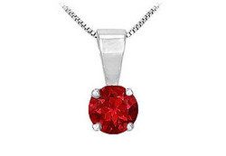 A round natural ruby is securely held in a luscious 14K white gold prong setting. This gemstone pendant has a total weight (TGW) of 1.00 and comes with a standard 16 14K white gold chain. Available in yellow gold also.