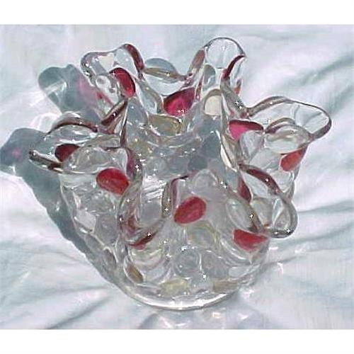 Ruby Stain Vase. I am certain this was made by Westmoreland Glass and is their 1,000 Eye Pattern. However I just saw it listed in a book as a Coin Spot Vase, but I am staying with the Westmoreland identification. I know that this is one of the RARER Vases with the Crimped edge and the Ruby Stain. It was very difficult to try to capture the beauty & pattern of this Vase. My 3rd shot shows it from above so you can see the Crimped edge which makes this particular Vase so RARE. It is 5 ½" tall x 8" across. It is in great condition with no chips or cracks and the Ruby Stain is approx 95%.