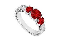 Three round radiant red rubies are prong-set in the center of the ring. The band is intricately designed in 14K white gold. This three stone ring has a total weight (TGW) of 0.75 ct.