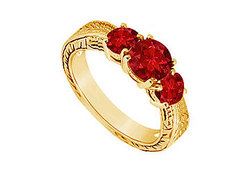 Three round radiant red rubies are prong-set in the center of the ring. The band is intricately designed in 14K yellow gold. This three stone ring has a total weight (TGW) of 0.75 ct.