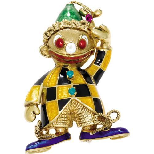 <B>Ruby, Turquoise, Enamel, Gold Brooch</B></I><BR><BR>The brooch, designed as a clown, features polychrome enamel applied on 18k yellow gold, complete with turquoise cabochons and a round-cut ruby accent. Circa 1960. Gross weight 33.90 grams. <I>(slight loss to enamel)</B></I><BR><I>Dimensions: 2-1/8 inches x 1-1/2 inches</B></I> <B>Condition Report:</B> Brooch<BR><BR>Colored Gemstones: Ruby, Turquoise<BR><BR>Average Clarity: Good<BR><BR>Shapes: Round Cabochon<BR><BR>Gemstone Count: 1-25<BR><BR>Overall Condition: Good<BR><BR>Notes: Slight loss to enamel on one eye and nose. The clown's nose is chipped. One of the turquoise cabochons is chipped.<BR><BR><BR><b>Shipping:</b> Miscellaneous Collectibles, Smal (<a target="_blank" href="http://www.heritageauctions.com/common/shipping.php">view shipping information</a>)