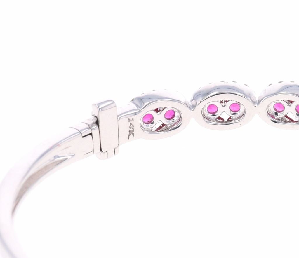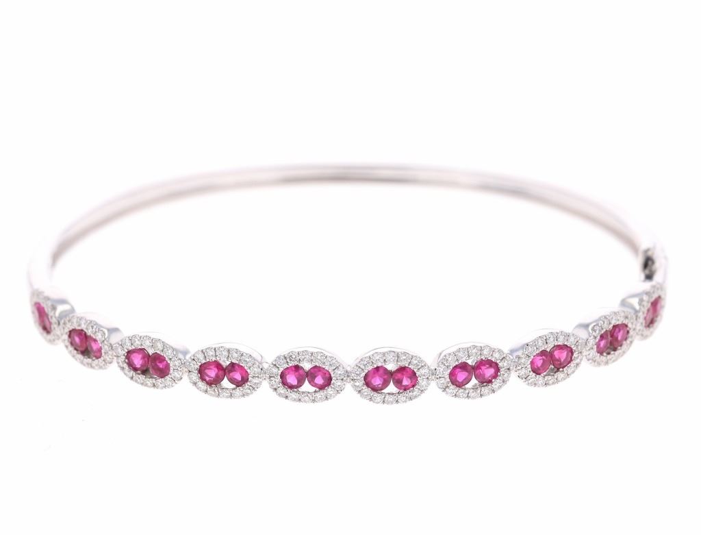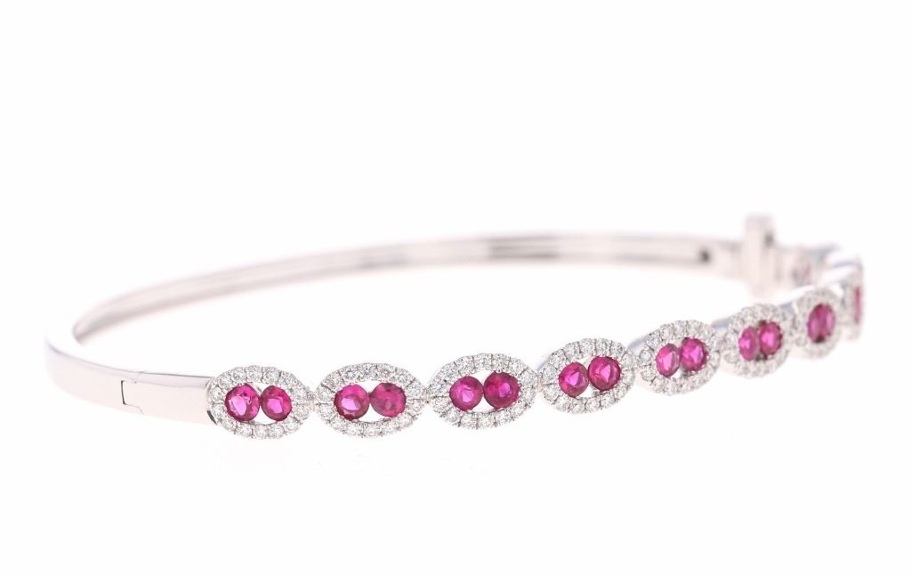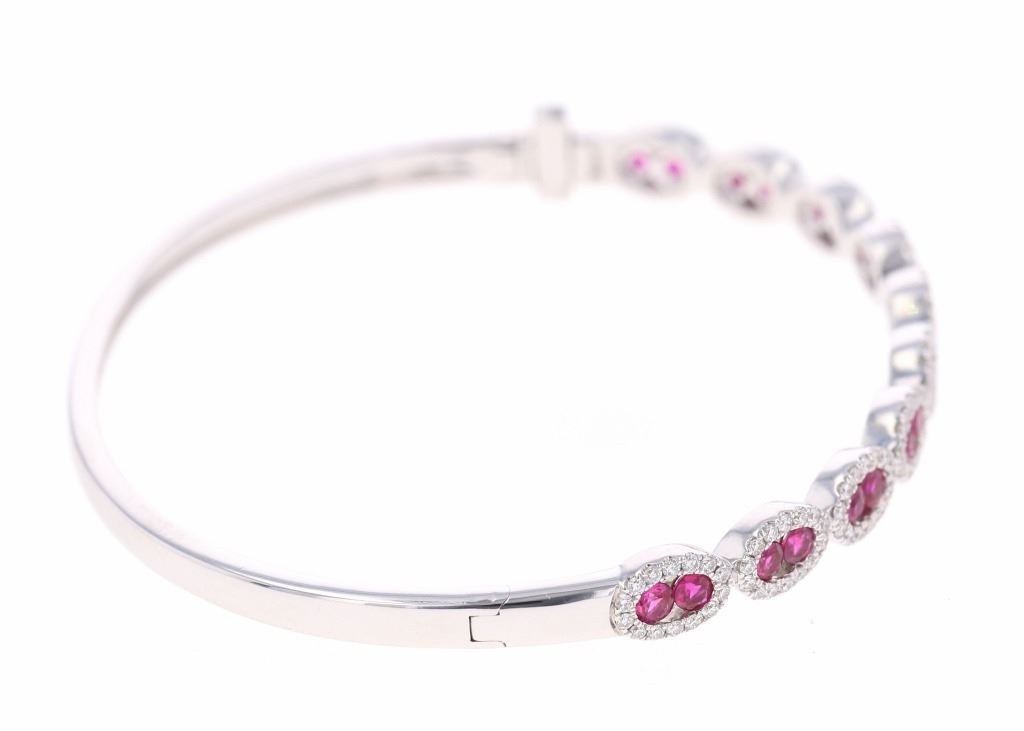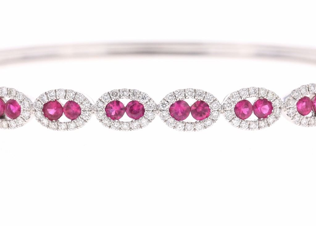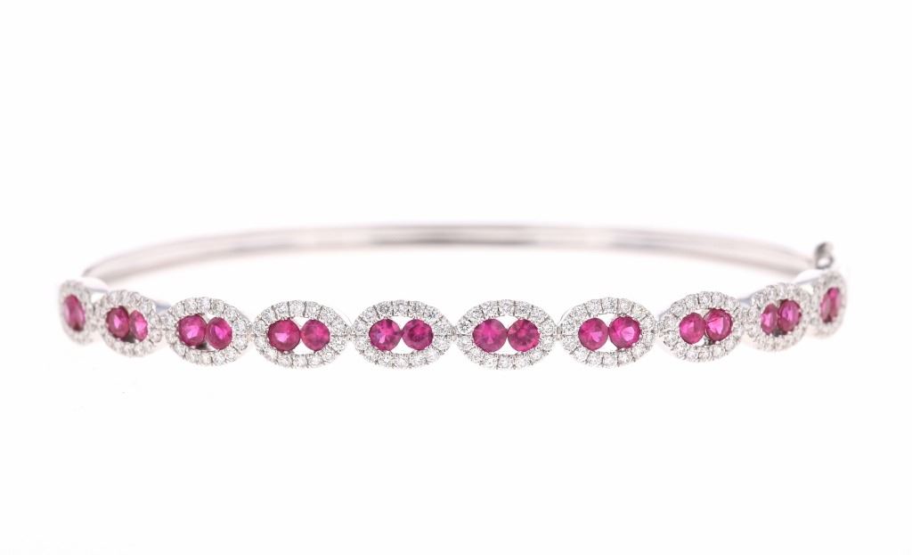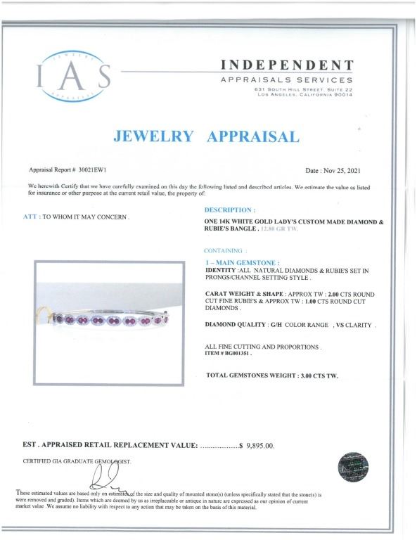 Featured in this lot is this ruby VS diamond and 14k white gold bangle bracelet with IAS paperwork. The bracelet features an electronically tested and stamped 14k white gold bracelet construction with a '14k' stamp on the locking clasp of the bracelet. The bracelet features 20 channel set rubies with a total of 2 carats and good quality. The center stones are decorated with tiny halo designs that show a total of 1 carat of round brilliant cut diamonds with VS clarity and a G - H color gradient. The piece comes complete with IAS (Independent Appraisals Services, a GIA certified lab IAS Appraisal Number#: 30021EW1) report and appraisal, confirming the above info and giving a total value of $9,895.00. The circumference of the bracelet is 5".