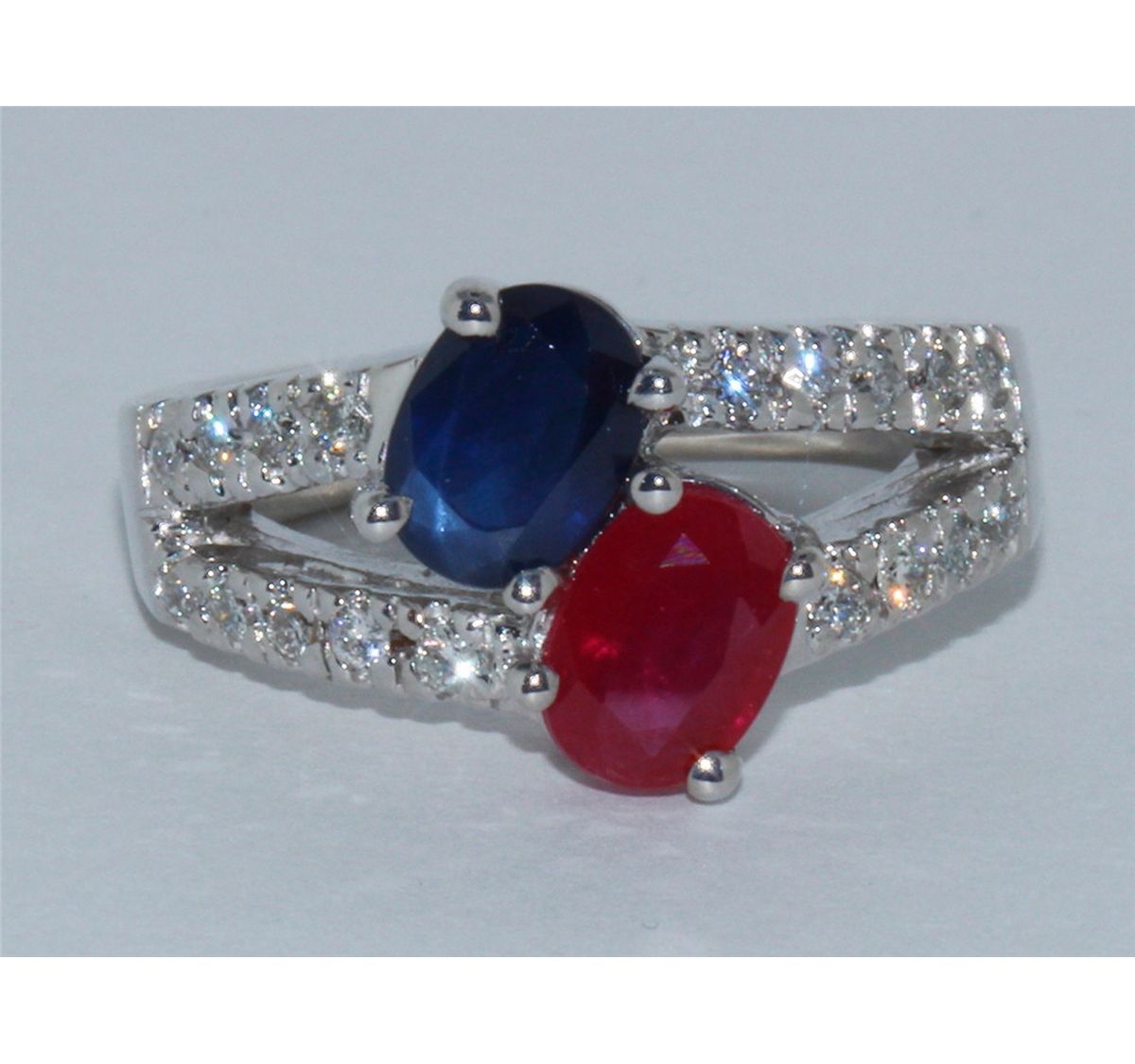 14k White Gold, Avg 1.00ct Blue Sapphire and Ruby Oval Great Color, .29cttw Round Diamond G-H color VS-SI clarity