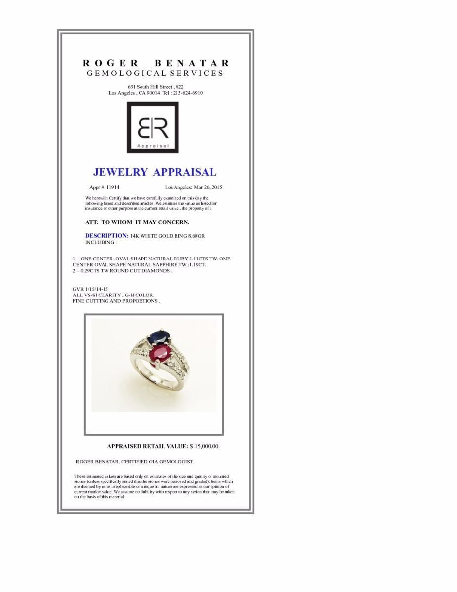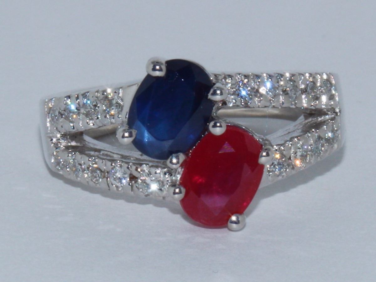 14k White Gold, Avg 1.00ct Blue Sapphire and Ruby Oval Great Color, .29ctw Round Diamond G-H color VS-SI clarity