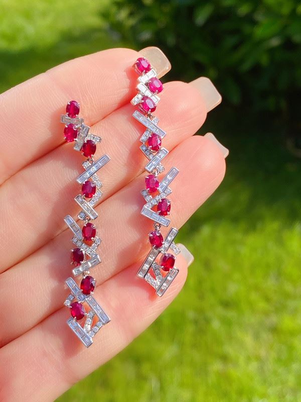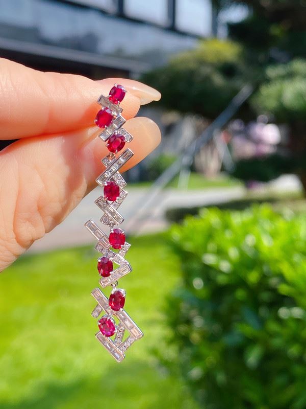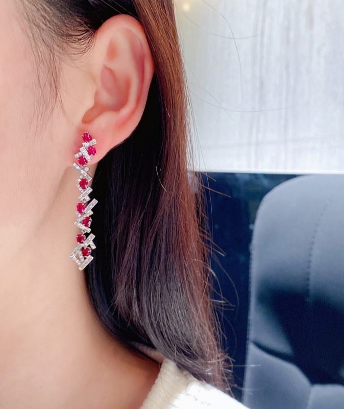 These earrings beautifully combine rubies and diamonds in a unique geometric design. The dazzling brilliance of the rubies and the sparkling clarity of the diamonds intertwine to create an elegant curve, perfectly highlighting the wearer's elegance. Each carefully selected gemstone exudes nobility and refinement, making them an ideal accessory for formal occasions or evening events, showcasing unparalleled luxury and sophistication.Ruby :3.40ct, diamond: 1.453ct. Note: Comes with an AGL certificate and a domestic jewelry identification certificate.