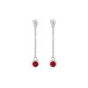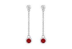 Two sparking brilliant-cut diamonds with 0.10 carat and 0.50 carat bezel-set red rubies gracefully hang from polished gold chains. These gorgeous dangling earrings are made in 14K white gold & have a total gem weight (TGW) of 0.60 carat.