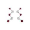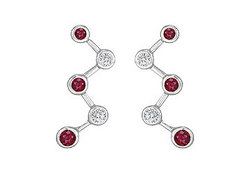 Three round radiant rubies alternate with two brilliant-cut diamonds in a stylish zig-zag design. These bezel-set graduating stones symbolize meaningful journeys in one's life. These earrings are made in 14K white gold & have a total gem weight (TGW) of 1.00 ct.