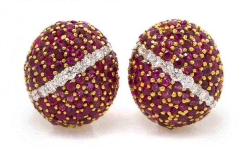 Ruby and Diamond Earrings. A Pair of 18 Karat Yellow Gold, Ruby and Diamond Bombe Earclips, containing 22 round brilliant cut diamonds weighing approximately 1.17 carats total and 206 round brilliant cut rubies weighing approximately 10.95 carats total, earclips measure approximately 21.50 x 19.25 mm. Stamp: Bianco 18K. 11.40 dwts.