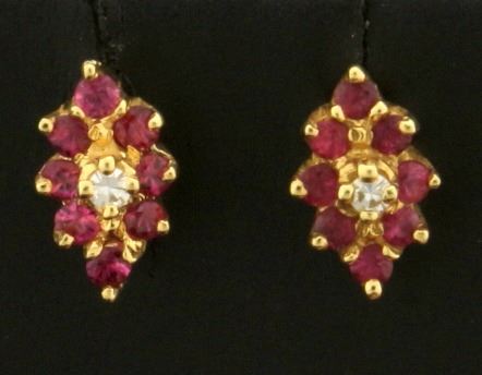 In 14k yellow gold, each earring contains eight 1.5mm rubies and a high quality diamond. 3/8 inches long with friction backs. 2.2g.