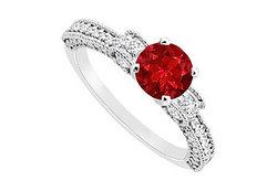 A brilliant-cut ruby is prong-set in the center in 14K white gold. Side rows of round diamonds with edges are detailed fine milgrain work to add a touch of style. This engagement ring has a total weight (TGW) of 1.00 carat and also available matching wedding band model no. W3132BW14D.