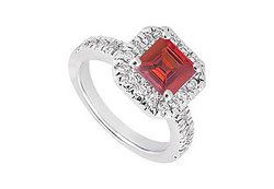 A vibrant red square ruby is surrounded by round diamonds all around it & also on both sides. Rendered in 14K white gold this engagement ring has a total gem weight (TGW) of 1.00 ct.