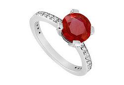Taking the centerstage a larger round rich red ruby is beautifully accented by smaller prong-set brilliant-cut diamonds. This engagement ring is made in 14K white gold & has a total weight (TGW) of 1.00 ct.
