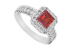 A square ruby is surrounded by brilliant-cut diamonds. Round diamonds are accentuated on both sides of the band also. Made in 14K white gold this engagement ring has a total weight (TGW) of 1.50 ct.
