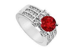 A brilliant-cut round radiant ruby is center-set atop between six round diamonds. Channel-set rows of round diamonds compliment the center stone on sides. Made in 14K white gold this engagement ring has a total weight (TGW) of 2.25 ct.
