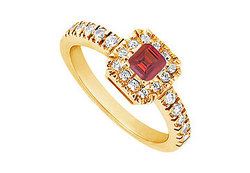A square radiant ruby is prong-set in the center & is accented by round diamonds. Rendered in 14K yellow gold this engagement ring has a total weight (TGW) of 0.50 ct.
