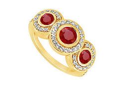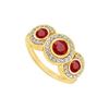 Three large brilliant-cut rich red rubies are bezel-set & encircled by smaller round diamonds. Made in 14K yellow gold this engagement ring has a total weight (TGW) of 0.66 ct.
