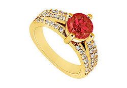 Three rows of round diamonds hold a large brilliant-cut ruby atop in the center. The middle row is slightly raised to add a stylish touch. This engagement ring is made in 14K yellow gold & has a total weight (TGW) of 1.00 ct.