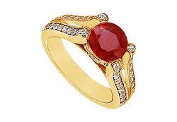 Two sleek curvy diamond rows delicately hold a round radiant ruby in the center. Smaller round diamonds encircle the centerstone from below. Made in 14K yellow gold this engagement ring has a total weight (TGW) of 1.00 ct.