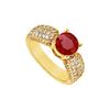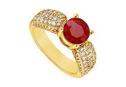 A brilliant-cut round ruby is prong-set atop in the center. An array of round diamonds accentuated on both sides give a look of diamond river. Made in 14K yellow gold this engagement ring has a total weight (TDW) of 1.00 ct.