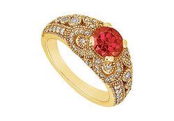 A brilliant-cut radiant ruby is prong-set in the center. Smaller diamonds are set in an intricate filigree work displayed in this ring. Made in 14K yellow gold this engagement ring has a total weight (TGW) of 1.00 ct.