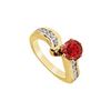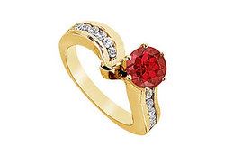 A brilliant-cut ruby with a TGW of 1.00 ct. sits in the center while smaller round diamonds are channel-set on curving side rows. Made in 14K yellow gold this engagement ring has a total weight (TGW) of 1.50 ct.