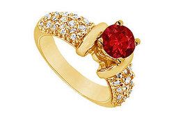 A brilliant ruby is prong-set between two solid stations. Round diamonds are set in a cluster on each side. Made in 14K yellow gold this engagement ring has a total weight (TGW) of 2.00 ct.