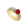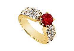 A brilliant-cut round ruby is center-set amidst a sparkling river of 30 smaller prong-set diamonds. This gorgeous wide engagement ring is made in 14K yellow gold & has a total weight (TGW) of 2.00 ct.