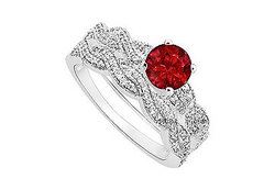 A brilliant-cut round ruby is delicately prong-set atop between smaller round diamonds twisted on a 14K white gold along with matching wedding band to make a perfect set of ring. This charming set of engagement ring has a total diamond weight (TGW) of 0.50 carat and wedding band as 0.30 carat.