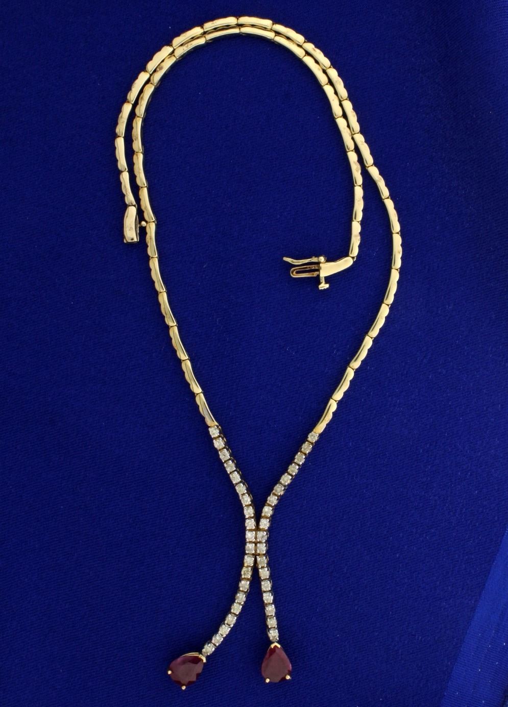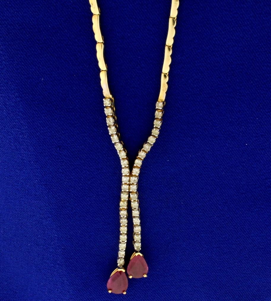 In 14k yellow gold, containing two pear shaped 1.75ct rubies with deep red color. Also contains 1 1/2 cts of high quality diamonds - I color/I clarity. 18 inches long. With safety clasp. 21.3g.