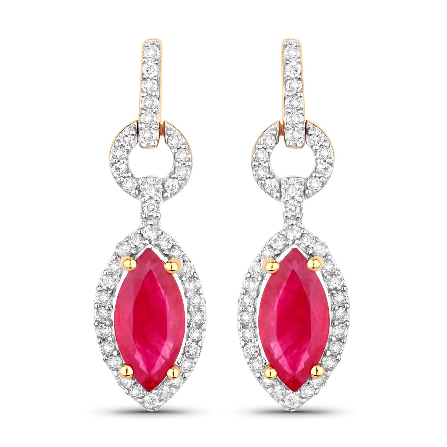 These 14 karat yellow gold dangling earrings feature 1.00 carats total weight of marquise-cut, prong-set, genuine rubies that demanded not only diamond halos, but diamond ear studs, and diamond dangles, as well. *The 8x4mm rubies are treated and enhanced to improve appearance. See below for more information. These doorknocker earrings have .26 carats of micropave' set round, brilliant-cut, H-I color, I1 clarity diamonds. They are 3/4" long and attach to the earlobe with posts and friction backs. AdminCode: Q/oni