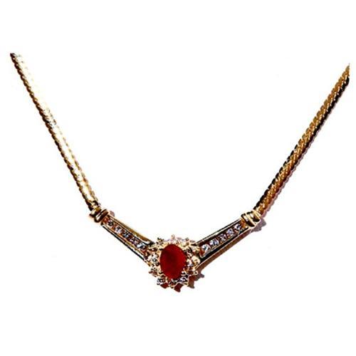 This 10kt. yellow gold necklace features one oval, .60ct. red ruby and eighteen round, .39ctw. VS2-SI1 diamonds. The necklace is 17 inches in length.