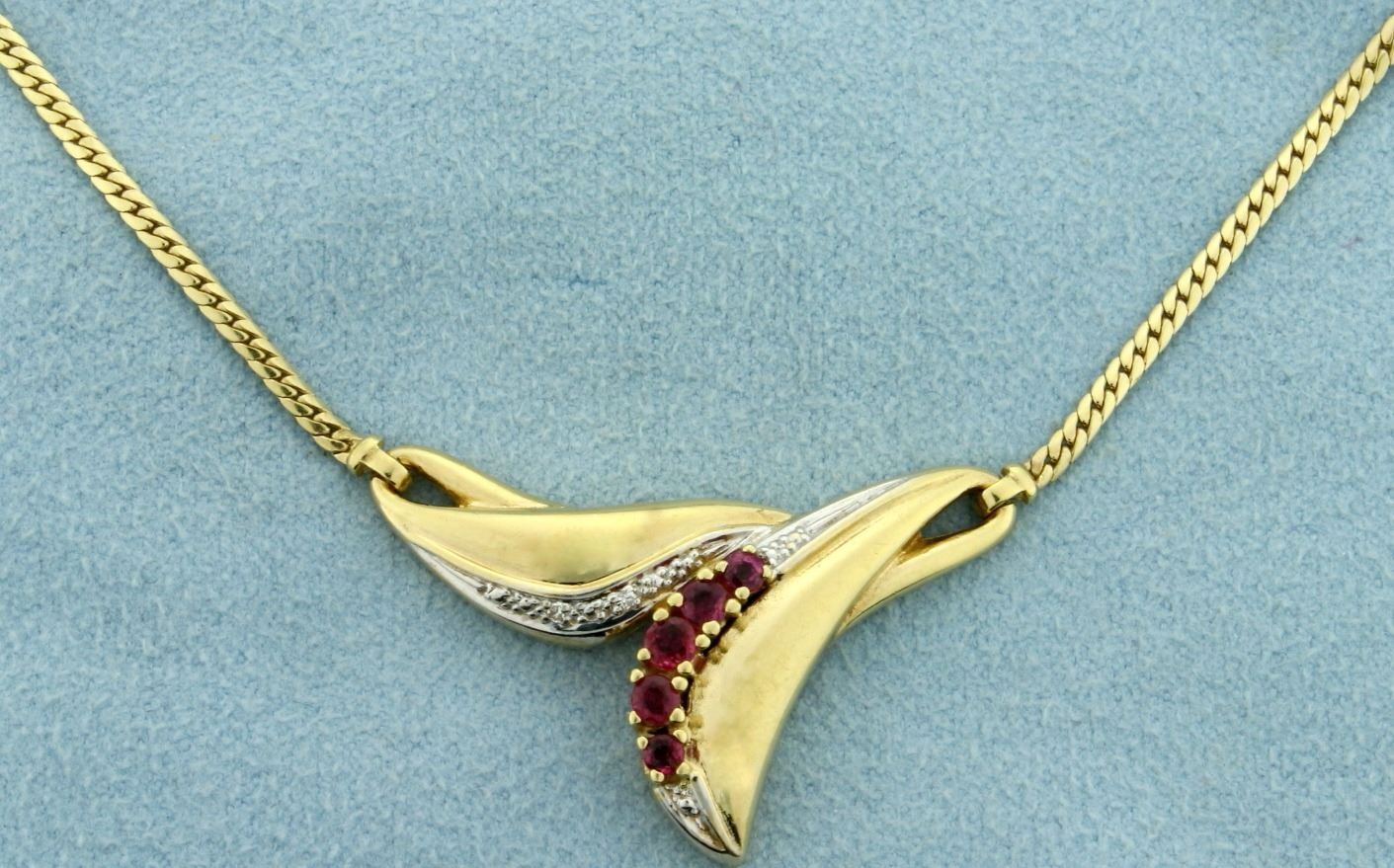 In 14k yellow and white gold. Contains five high quality natural ruby gemstones with beautiful ruby red color and excellent clarity, ranging from 2mm to 3mm. Also contains two high quality 1/2pt round diamonds. 17" long, with lobster clasp. 7.8g.