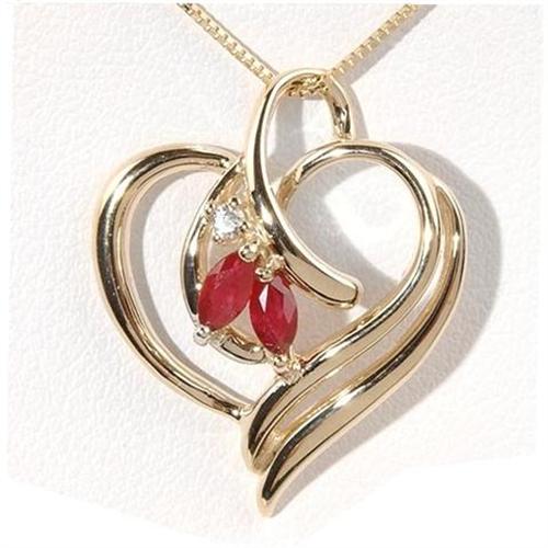 14kt. yellow gold holds two marquise .50ctw. rubies and one round .03ct. diamond in this open heart pendant. The diamond is VS2 in clarity and g-h in color. The pendant comes on an 18 inch 14kt. yellow gold chain.