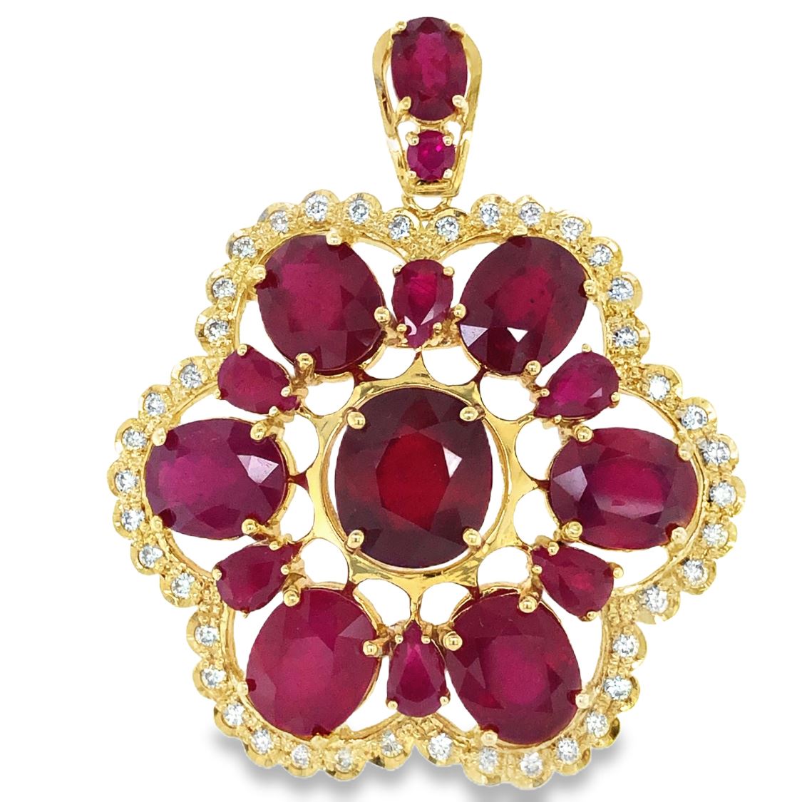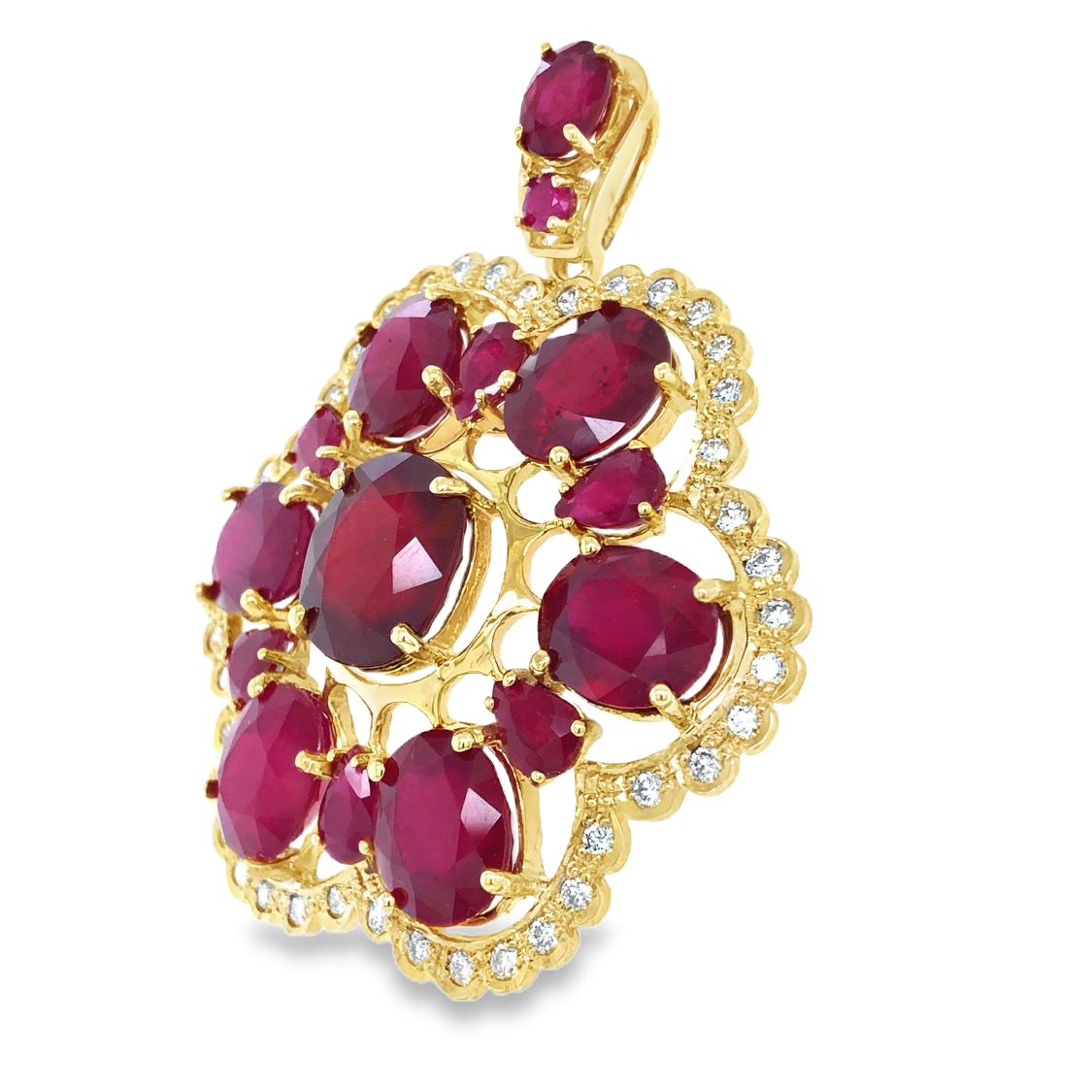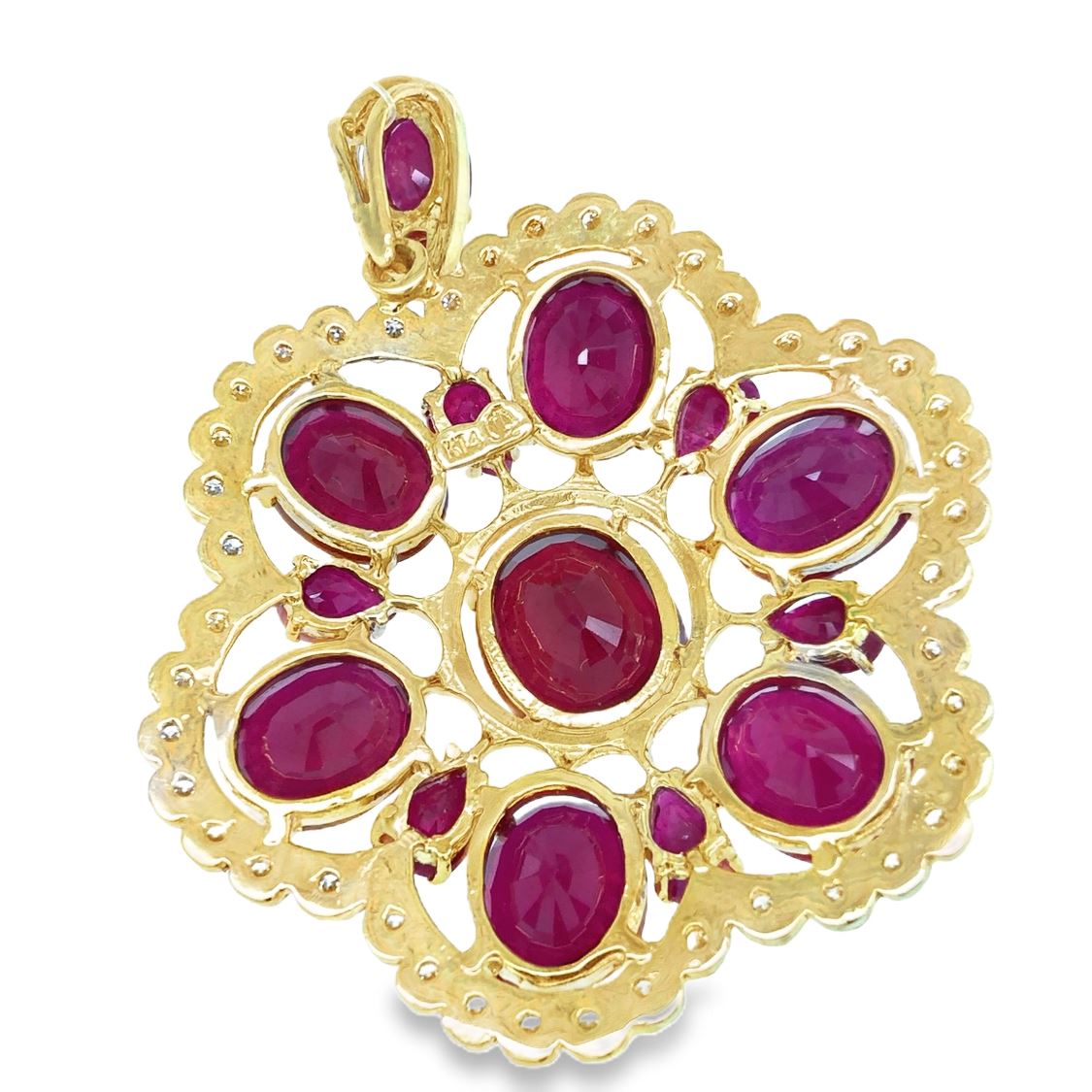 DESCRIPTION DETAIL: A stunning 14k Yellow Gold Ruby and Diamond pendant. The pendant contains several glass composite Rubies surrounded by round brilliant cut natural Diamonds.