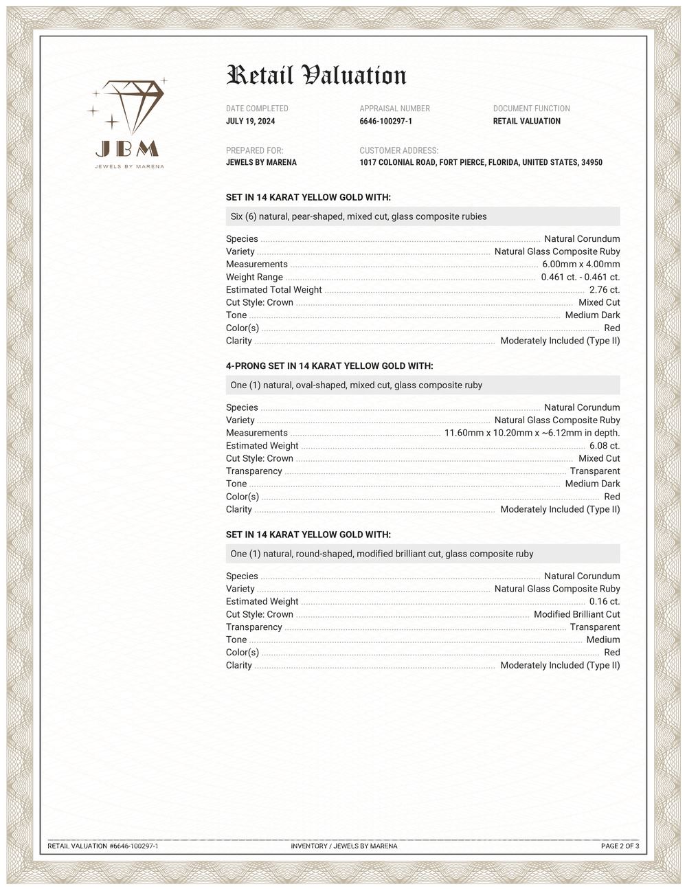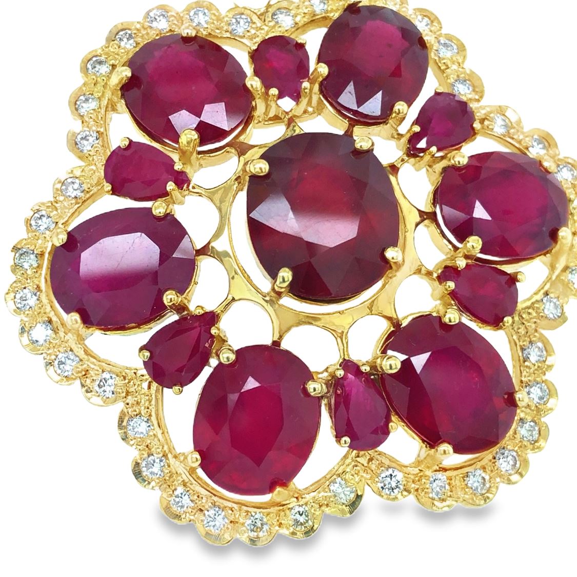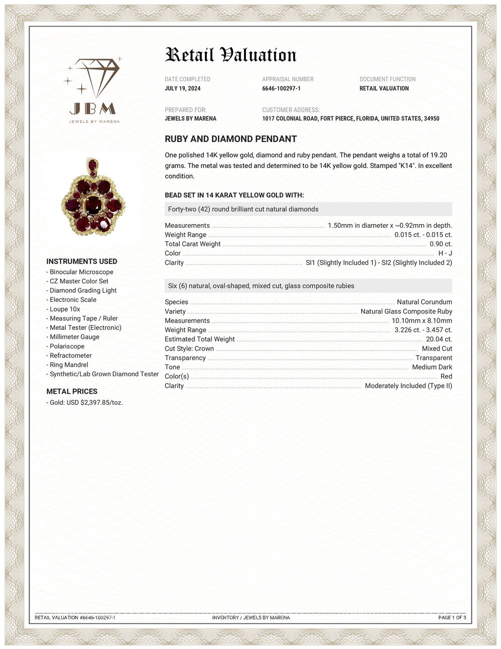 DESCRIPTION DETAIL: A stunning 14k Yellow Gold Ruby and Diamond pendant. The pendant contains several glass composite Rubies surrounded by round brilliant cut natural Diamonds.