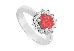 Set in the center is a brilliant-cut round ruby. An array of round dazzling diamonds forms a surrounding circle to bring out the natural beauty of the gemstone. Made in 14K white gold this ring has a total weight (TGW) of 1.50 ct.