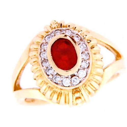 Size 7---The posted picture doesn't capture the sparkle in these stones. One oval .60ct. red ruby is bezel set and surrounded by fifteen .15ctw. diamonds in this ornate 14kt. gold setting. The diamonds are round, prong set and SI2 in clarity.