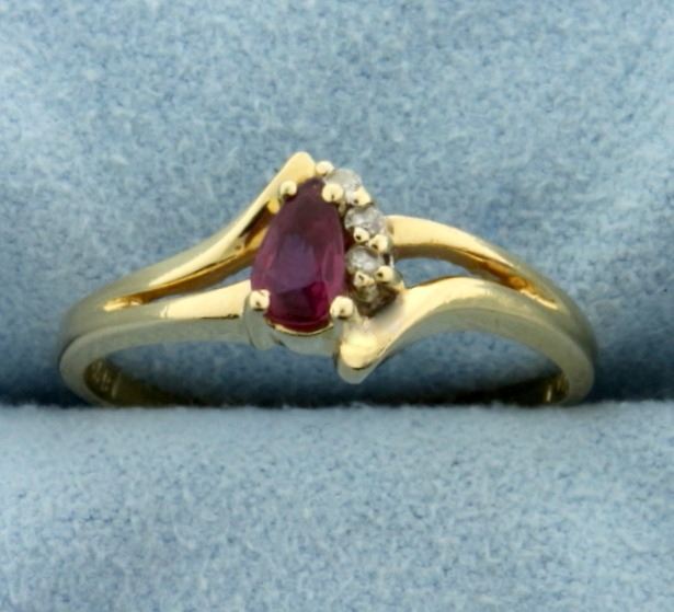 In 14K Yellow Gold. Contains a natural 5x3mm pear shaped Ruby gemstone with excellent clarity and beautiful color. Also contains three high quality .01ct Diamonds. Size 6 3/4. 2.1g