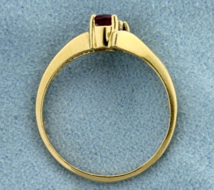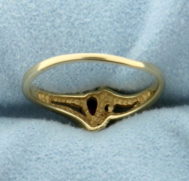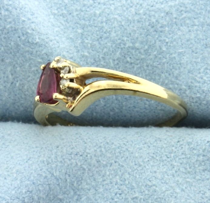 In 14K Yellow Gold. Contains a natural 5x3mm pear shaped Ruby gemstone with excellent clarity and beautiful color. Also contains three high quality .01ct Diamonds. Size 6 3/4. 2.1g