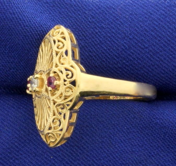 In 14k yellow gold. Contains a high quality .15 ct round diamond, SI clarity/H color. Also contains two natural 2.5mm ruby gemstones with bright red color and excellent clarity. Size 8 1/2. 5.3g.