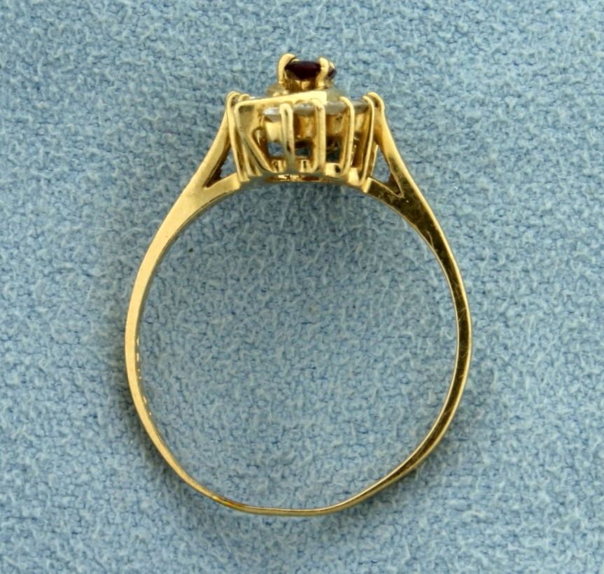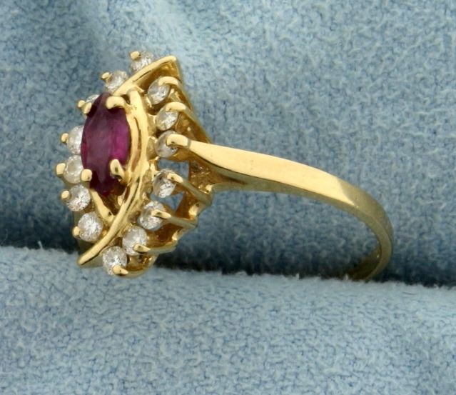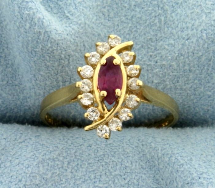 In 14k yellow gold, containing 1/3ct Marquise shaped Ruby with deep red color surrounded by fourteen .01ct high quality round diamonds. Size 6 1/2. 1.9g.