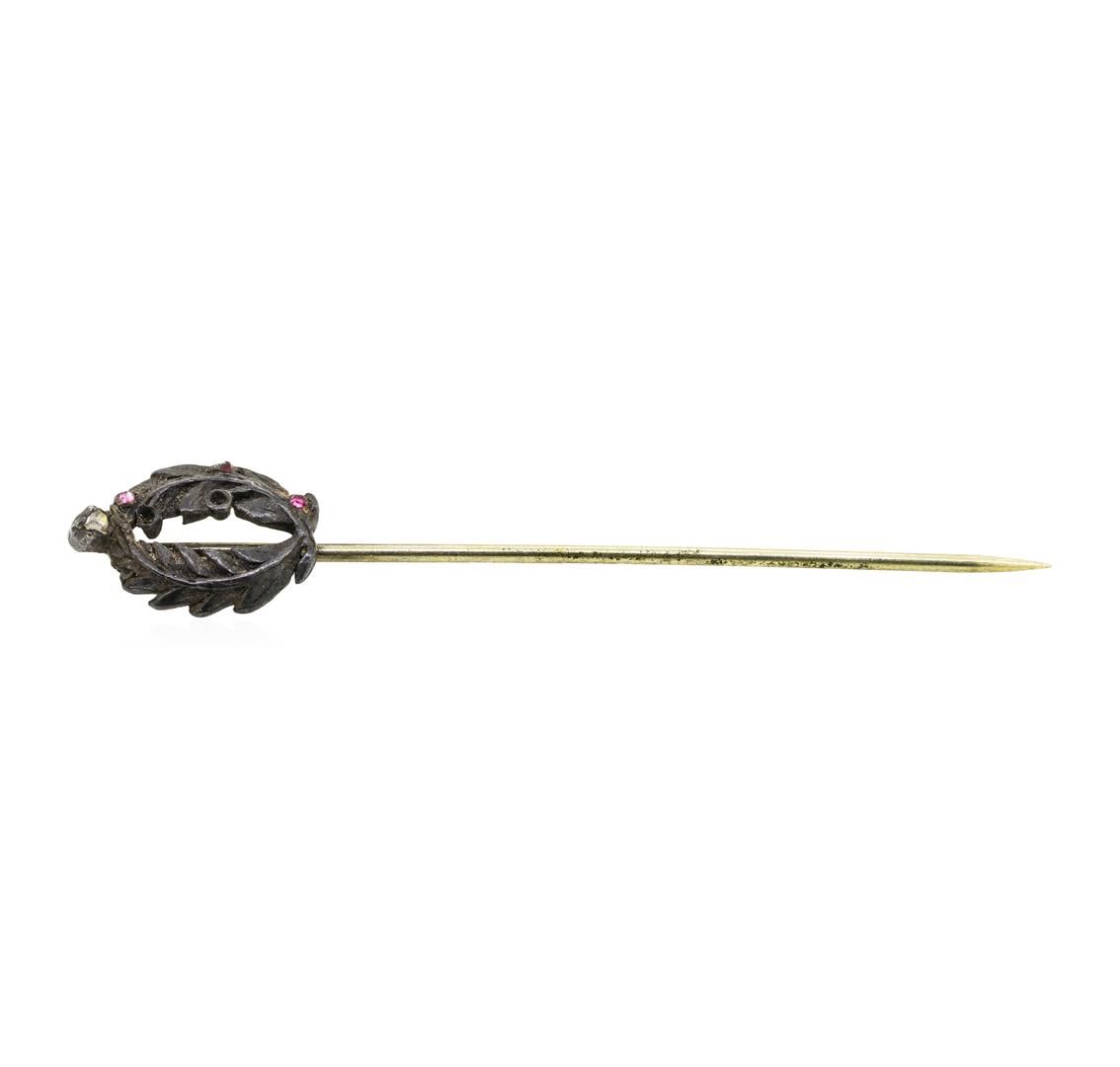 One stick pin featuring: silver weighing 1.7 grams containing three rubies and one diamond.