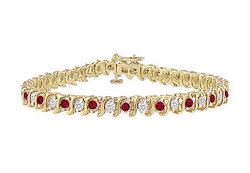 Get caught in the rapture of rubies and diamonds. Radiant round rubies alternate with brilliant-cut diamonds with delicate S links in between. With gems consistent all around it symbolizes your eternal love. This tennis bracelet is made in 14K yellow gold and has a total gem weight (TGW) of 4.00 ct.