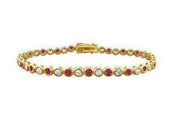 Get caught in the rapture of rubies and diamonds. Radiant round rubies alternate with brilliant-cut diamonds in a 18K yellow gold bezel-setting. With gems consistent all around it symbolizes your eternal love. This tennis bracelet has a total gem weight (TGW) of 3.00 ct.