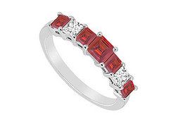A square bigger red ruby is prong-set atop in the center between smaller square rubies & princess-cut diamonds on both sides. Made in 14K white gold this wedding band has a total gem weight (TGW) of 2.50 carat.
