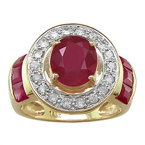 A super 5.50ctw Ruby and White Sapphire size 7 ring set in a 4.76 gram 14KT yellow gold mounting. There is 4.87ctw in Rubies. The center stone is oval cut and the side mounted rubies are square cut and all are fine in color and clarity. There are .63ctw of surrounding round cut White Sapphires that are extra fine in color and clarity.