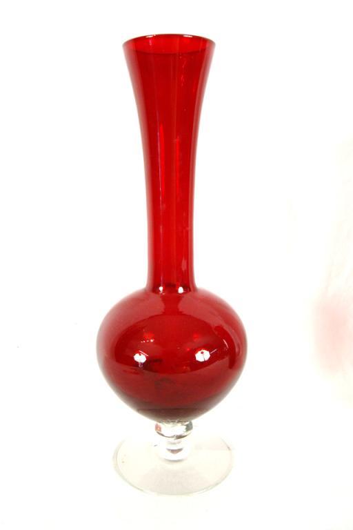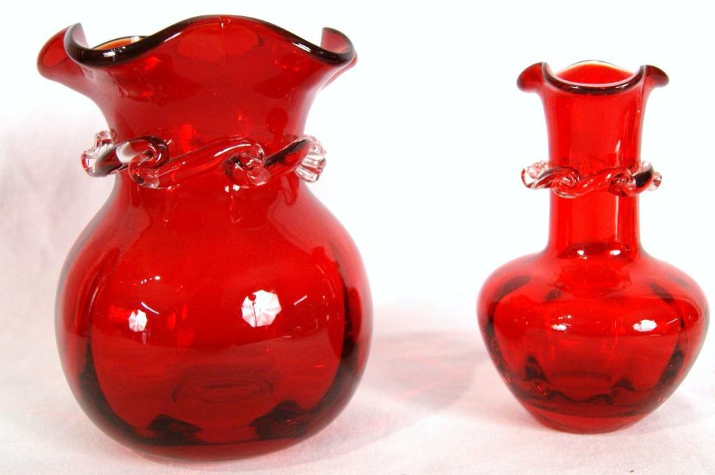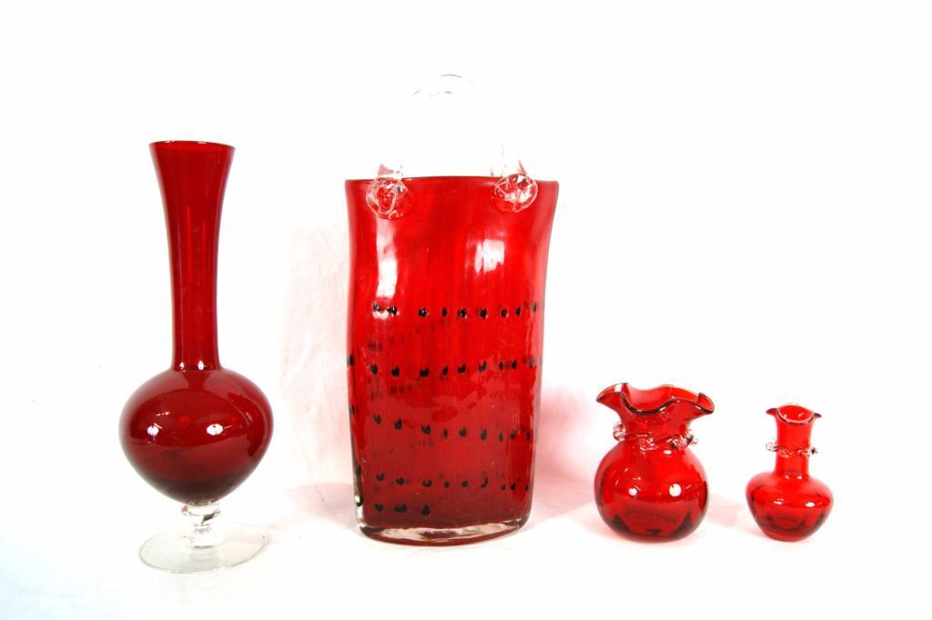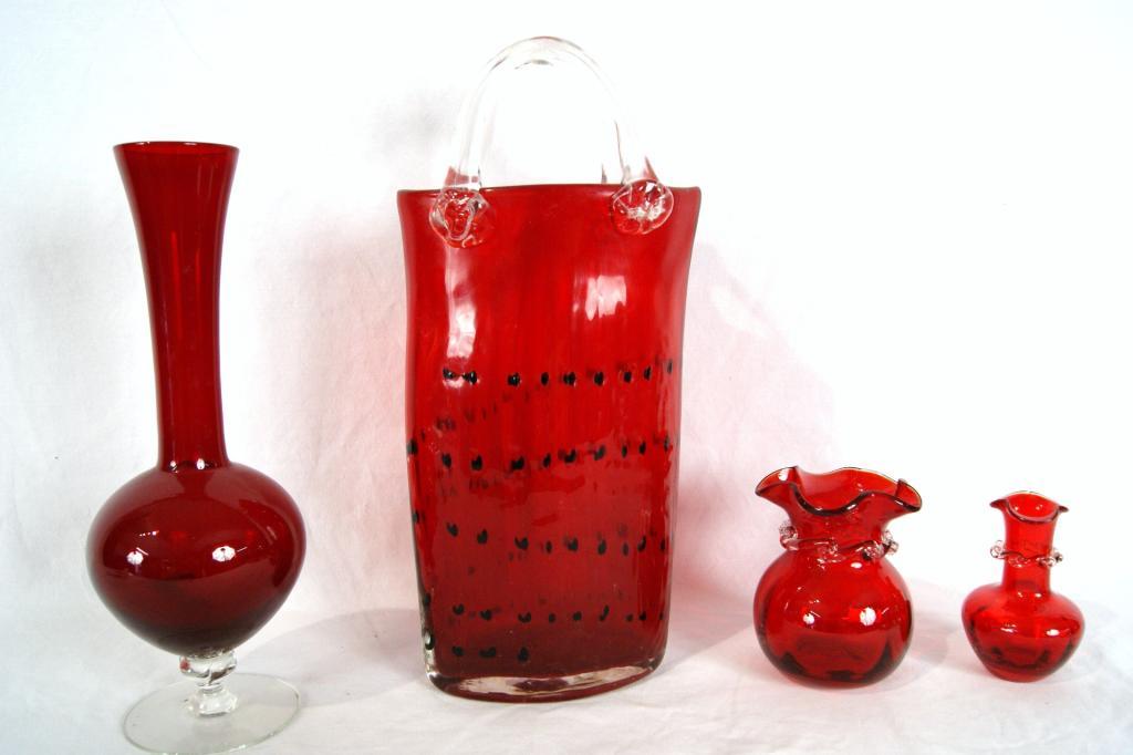 Ruby & clear applied handles vase, basket vase & 2 small vases - 4pcs