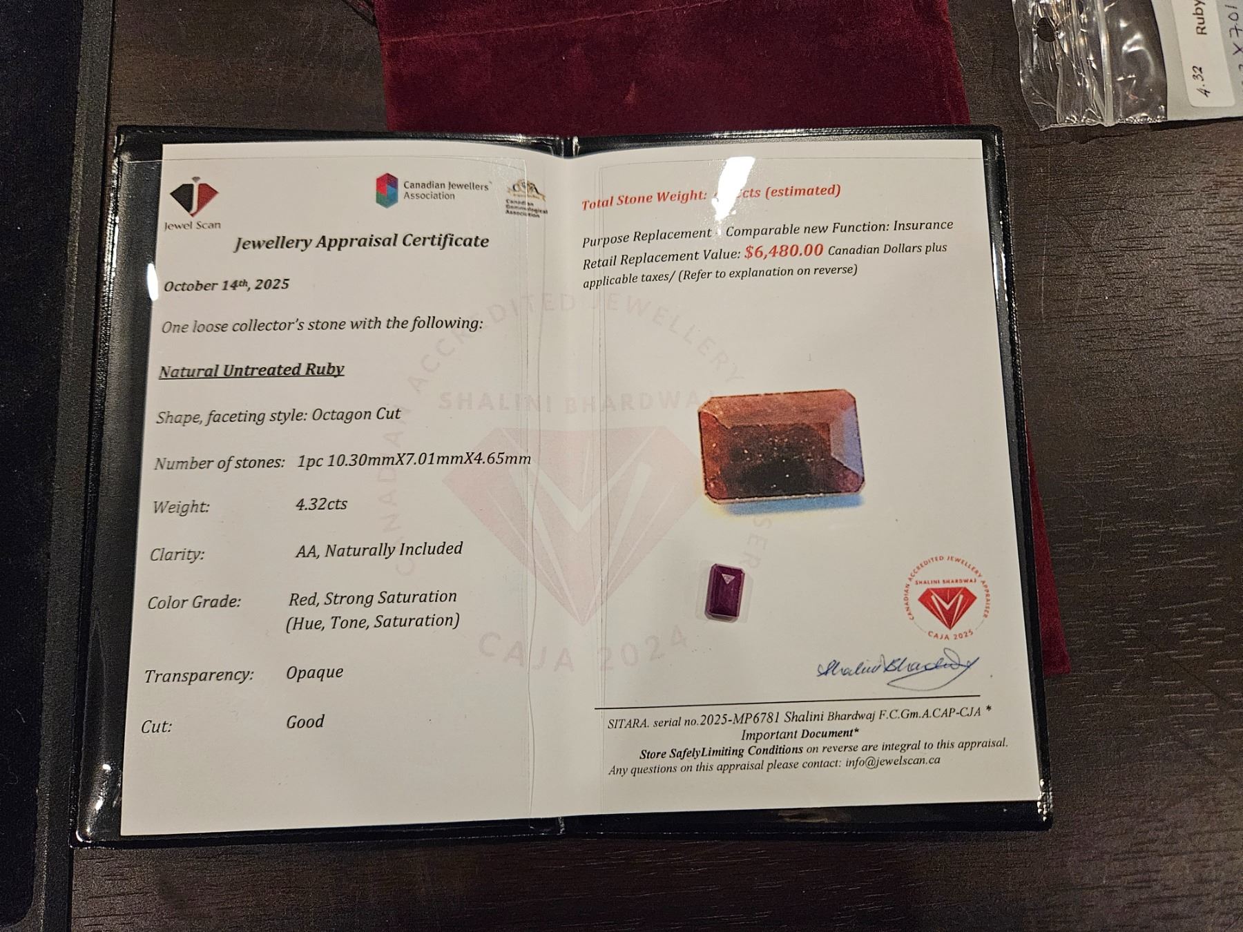4.32ct total weight, untreated ruby, Oval shaped. retail vaue $6,480.00