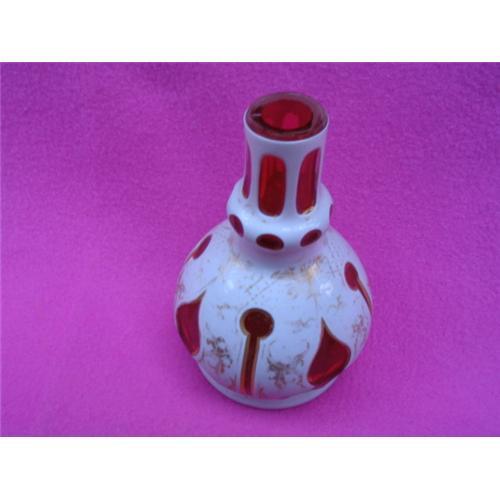 Alluring shape and contrasting mixture of deep ruby red glass highlighted to make it richer in appearance by white and gold. Such a unique little vase that brings a sense of European mystery with it's choice of design. Outstanding.