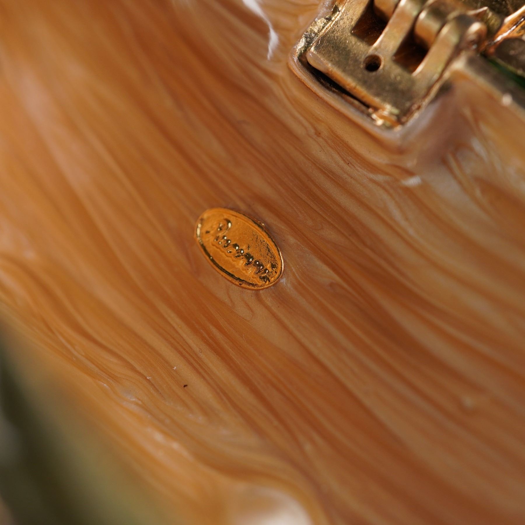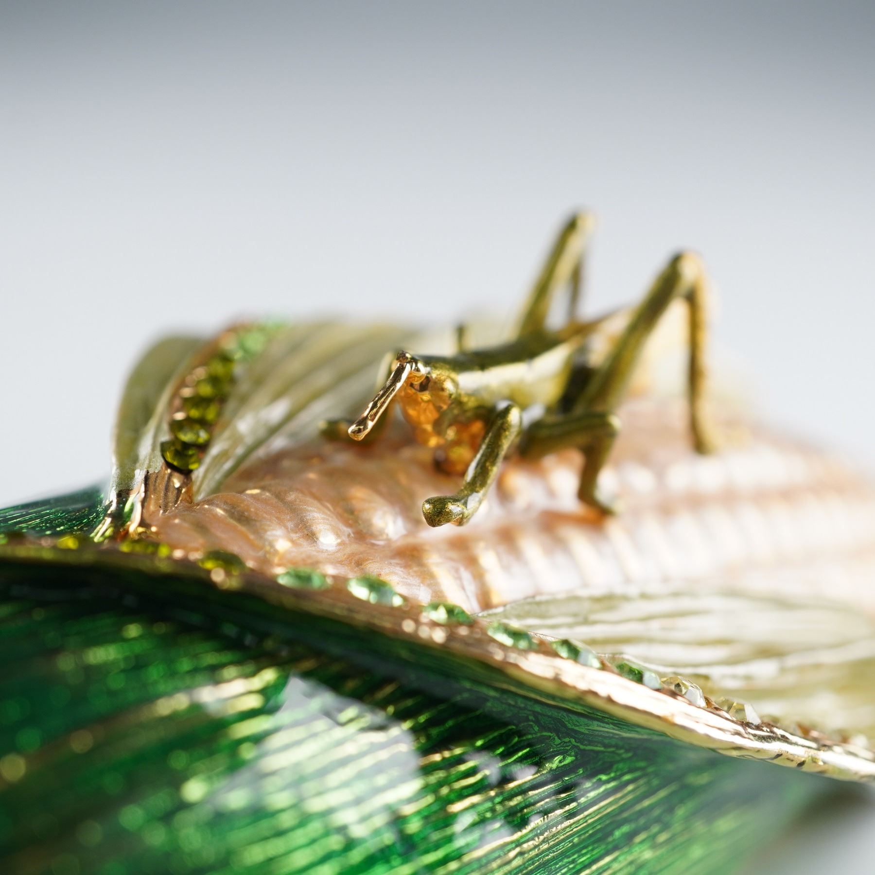Charming figural trinket box by Rucinni in the form of an ear of corn, crafted with exquisite attention to detail. The husk is rendered in glossy green and cream enamel with accents of shimmering green and amber rhinestones. The exposed kernels are finished in a soft pearlized pink tone, and a gold-tone grasshopper is perched atop for added whimsy. The piece is hinged and opens to reveal a small interior compartment. Signed Rucinni on an oval cartouche on the interior. Measures 5"L x 1.75"H.